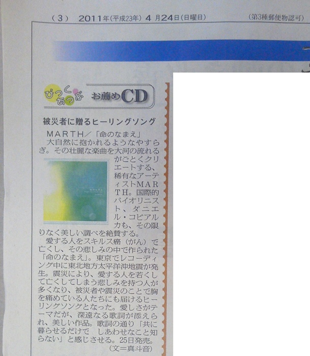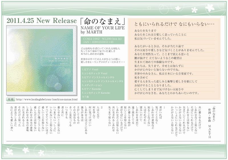 | 2011/05/19 | Amazon co.jp MP3ストア | 癒しの音楽特集ページにて「命のなまえ」掲載 >>ページを見る |